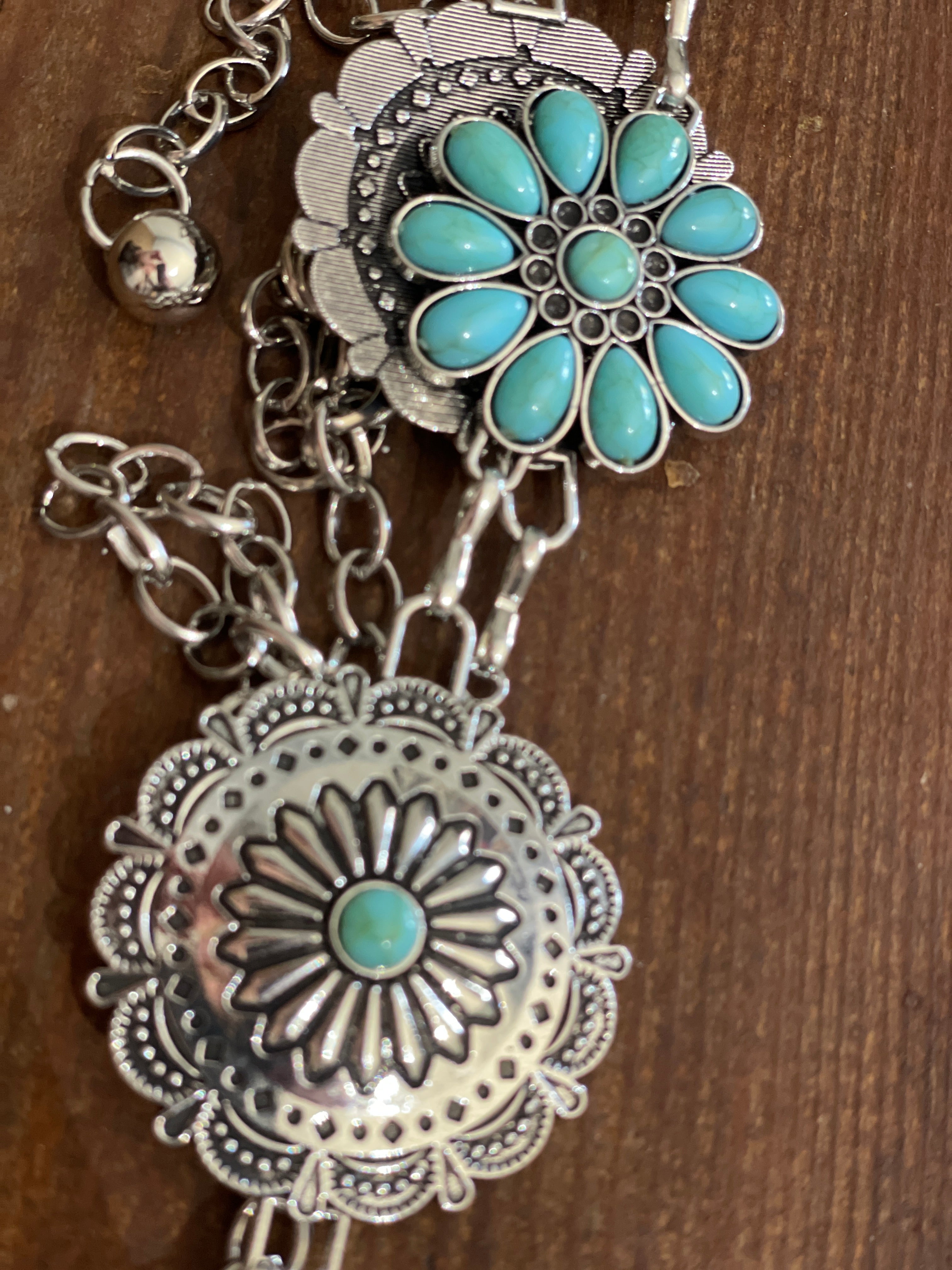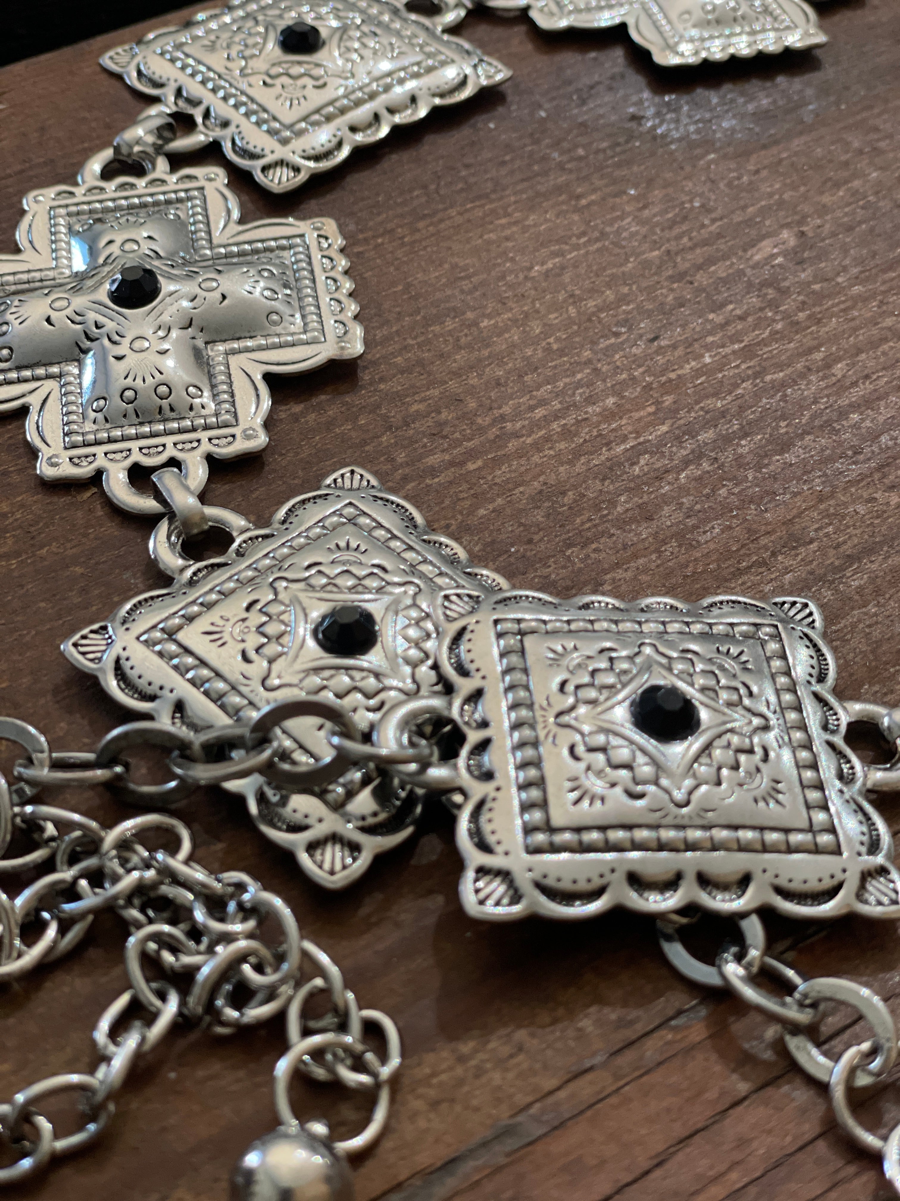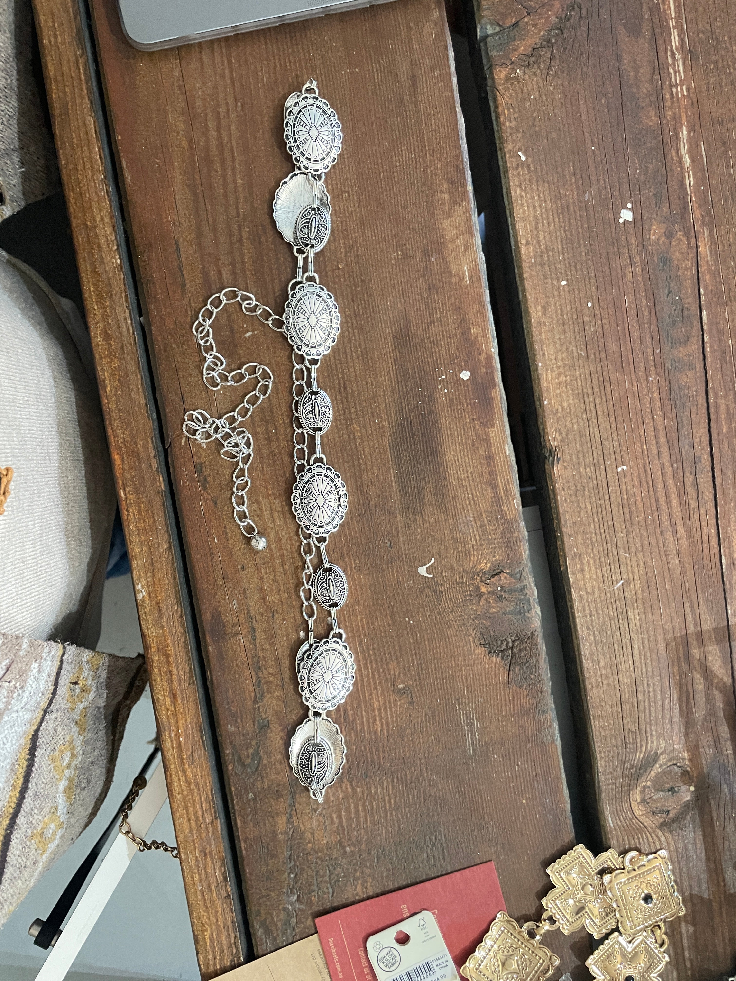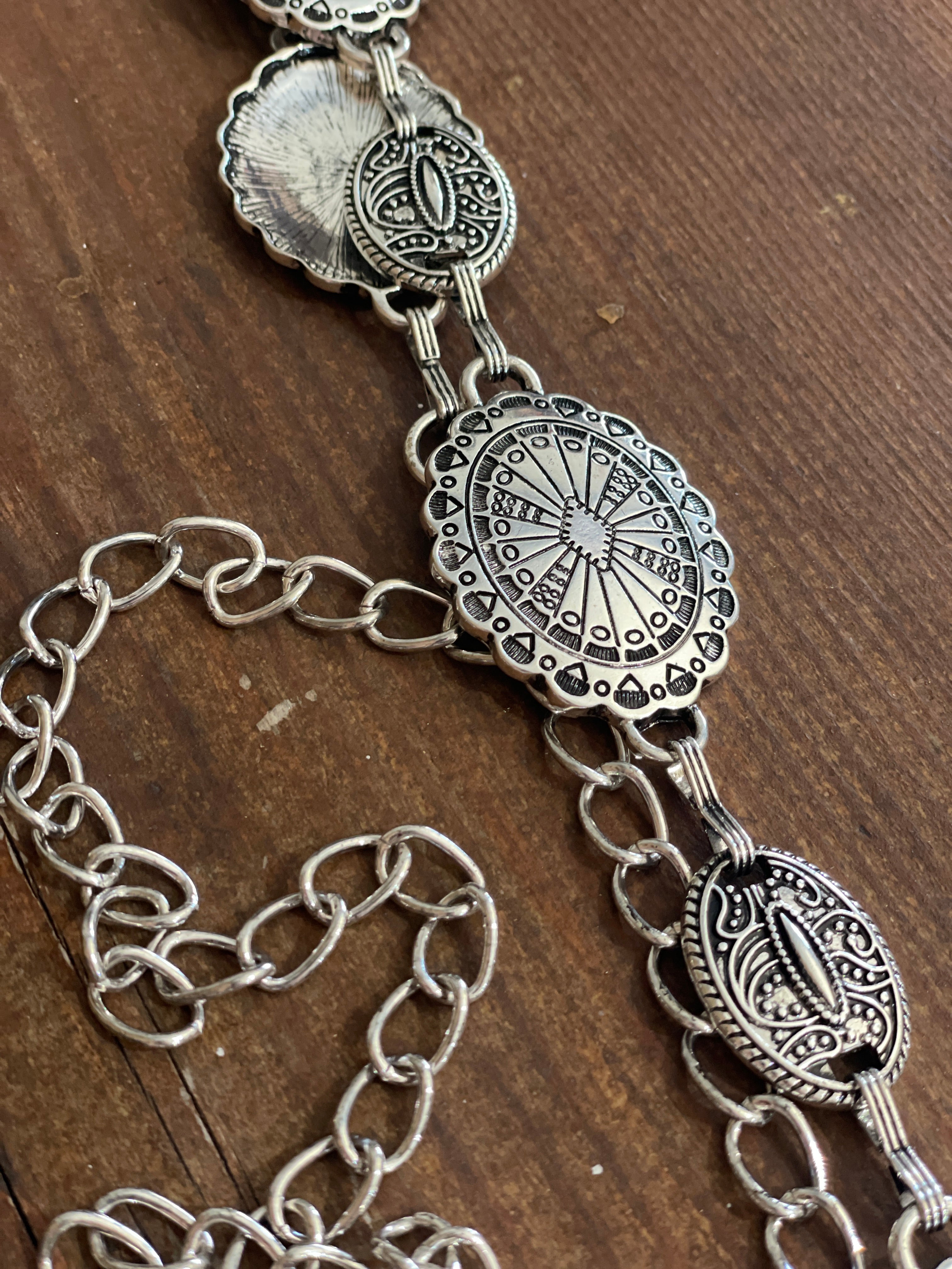 Light weight pressed metal concho belt. Fully adjustable one size fits most.
