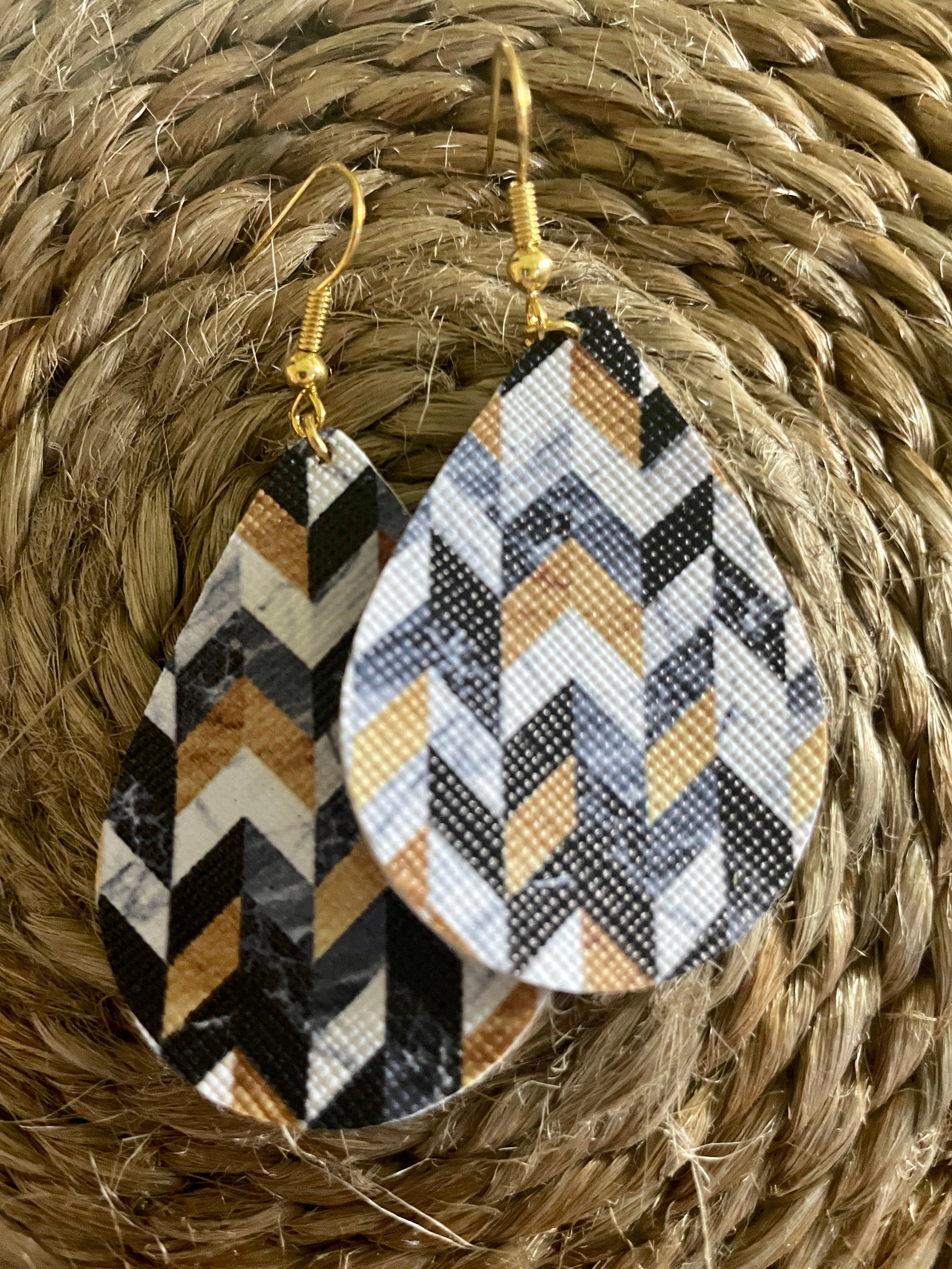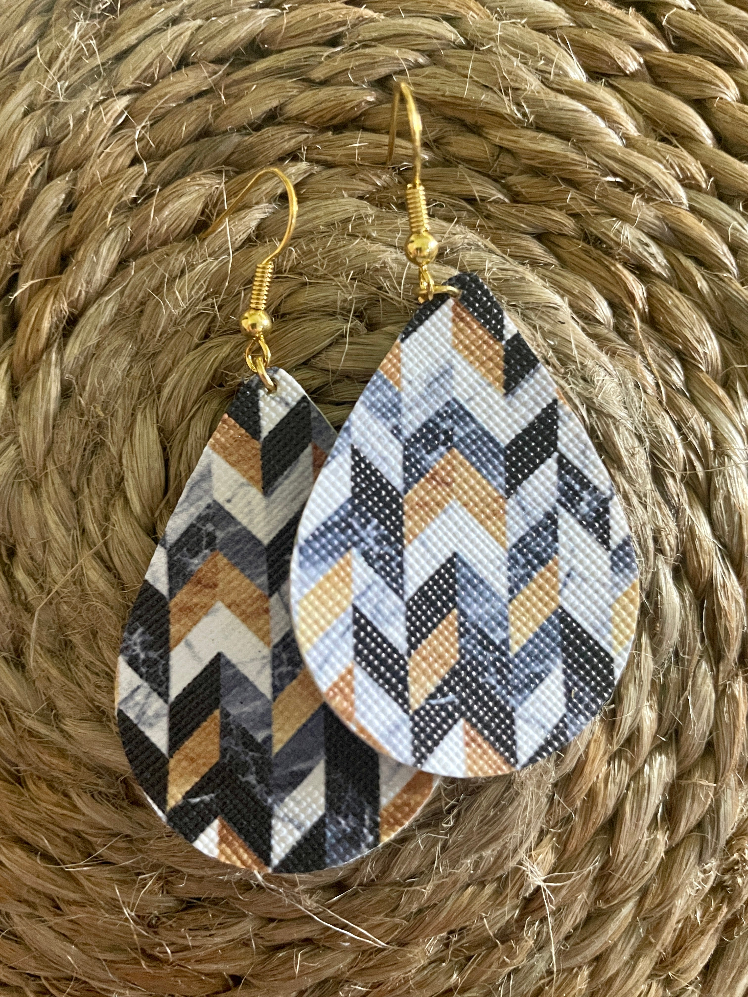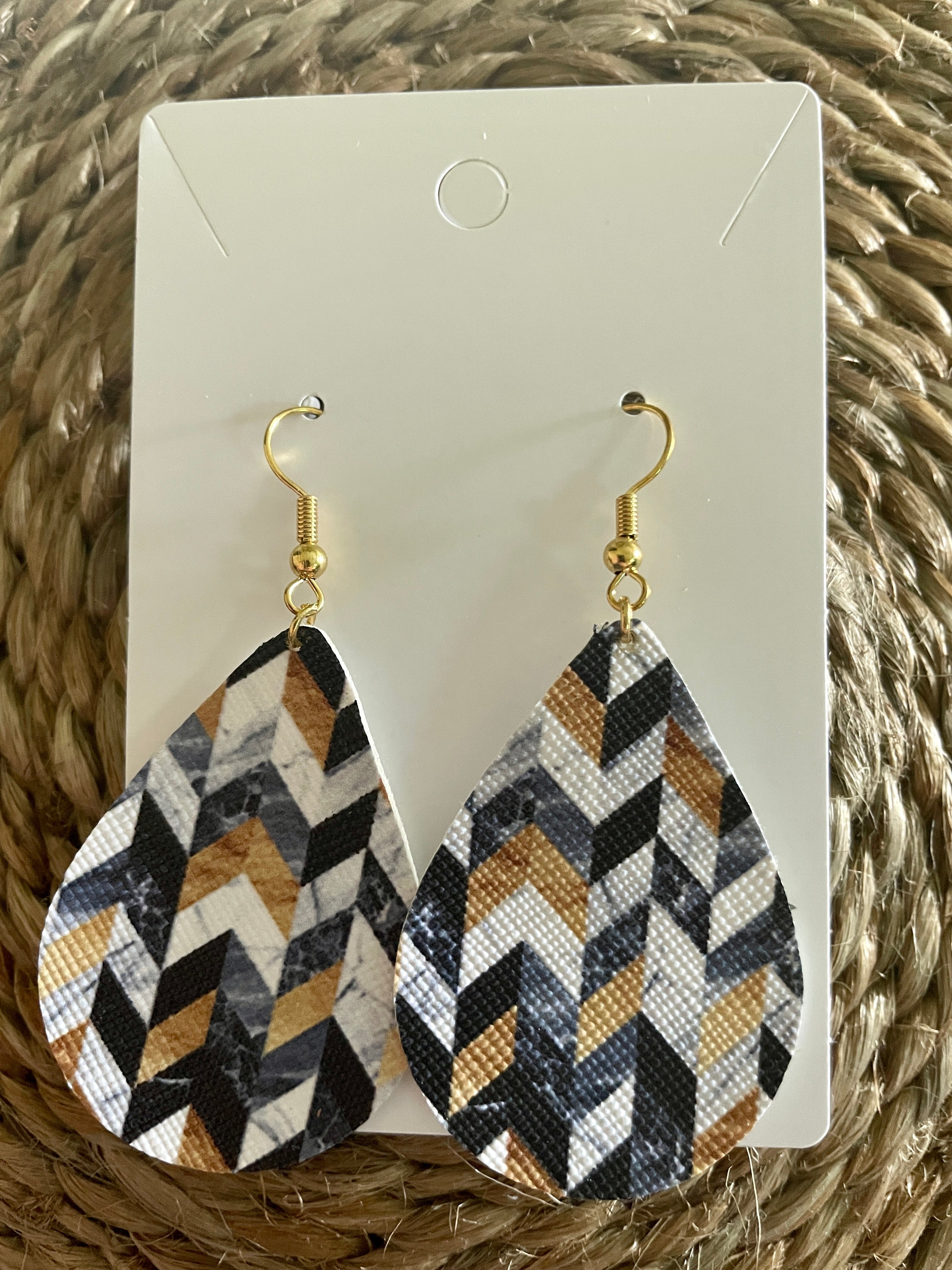 Combination of dusty denim blue, navy, white marble and gold tone symmetrical patterned teardrop leatherette earrings are hand made on surgical steal earring hooks making them ideal for this with sensitive ears. These are super light weight and easy to wear and go with SO many outfits they'll be your new faves, we're sure of it.