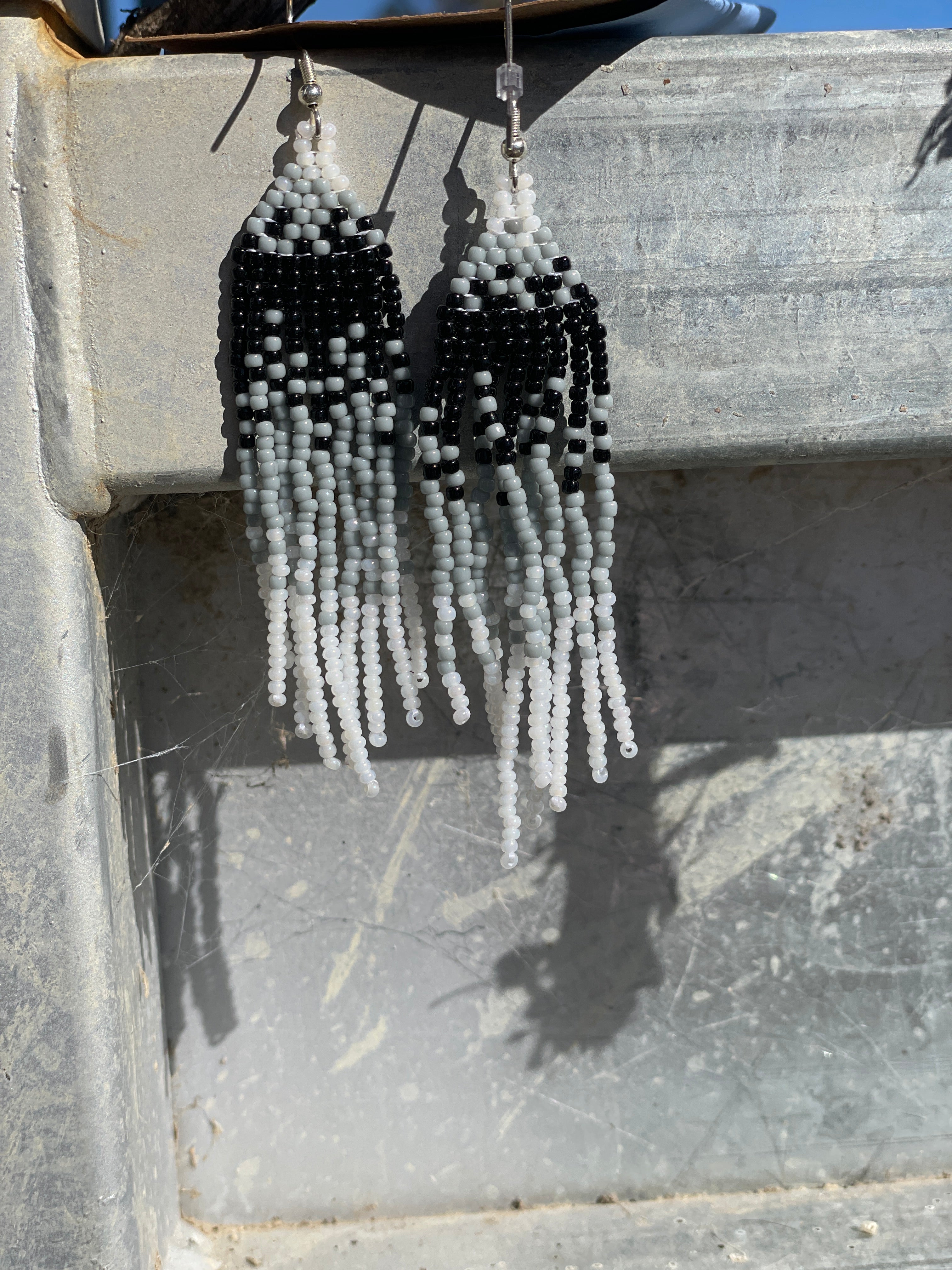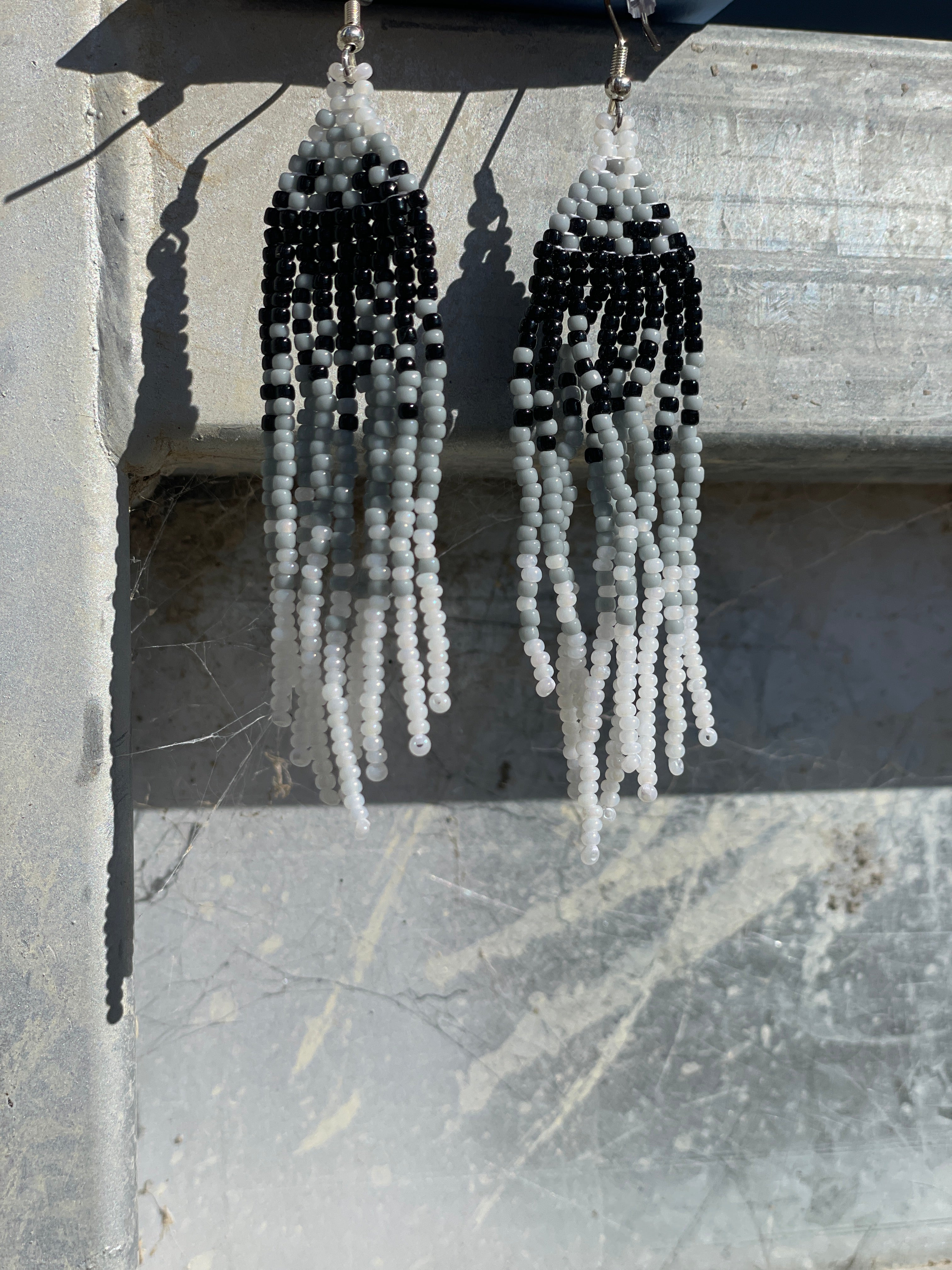 Hand made glass bead fringe style earrings. Colour fading and contrasting with black, grey and white colour combination. A simple slip on hook and light weight earring makes them easy to wear.