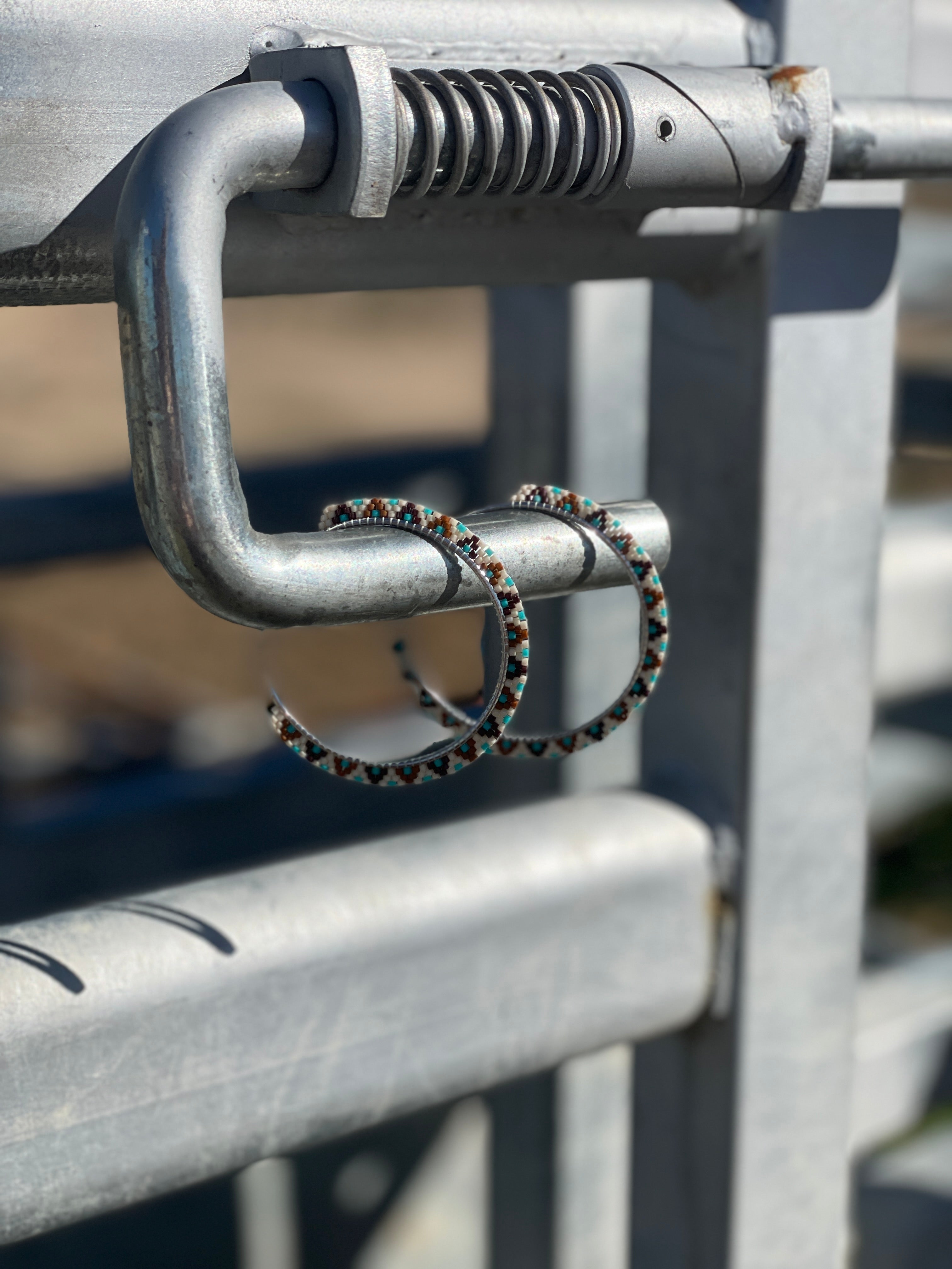 2" hoop frame with beading finely beaded with glass beads in a pattern using cream, dark brown, tan and turquoise combination. they fasten in the ear and clip closed.
