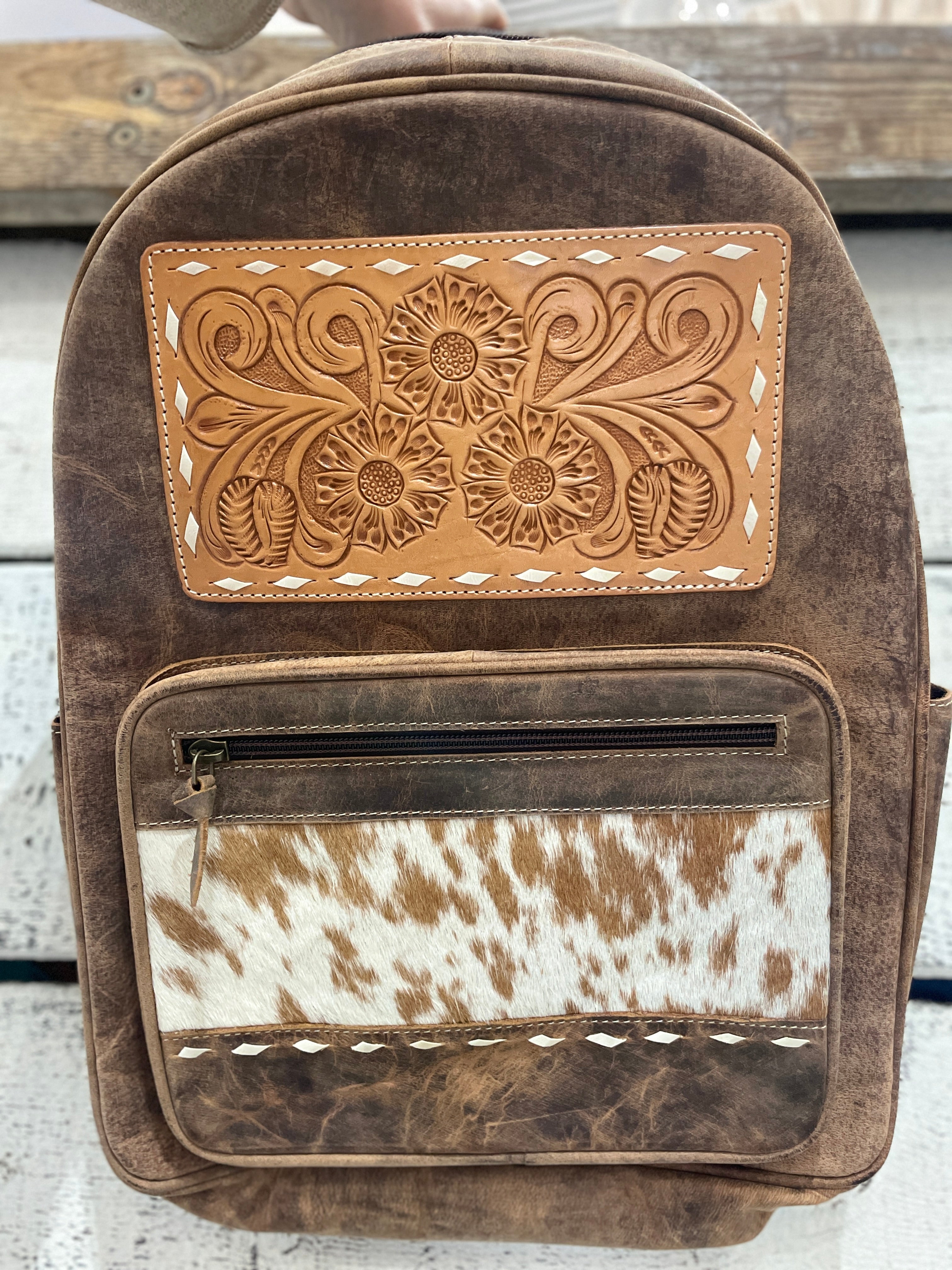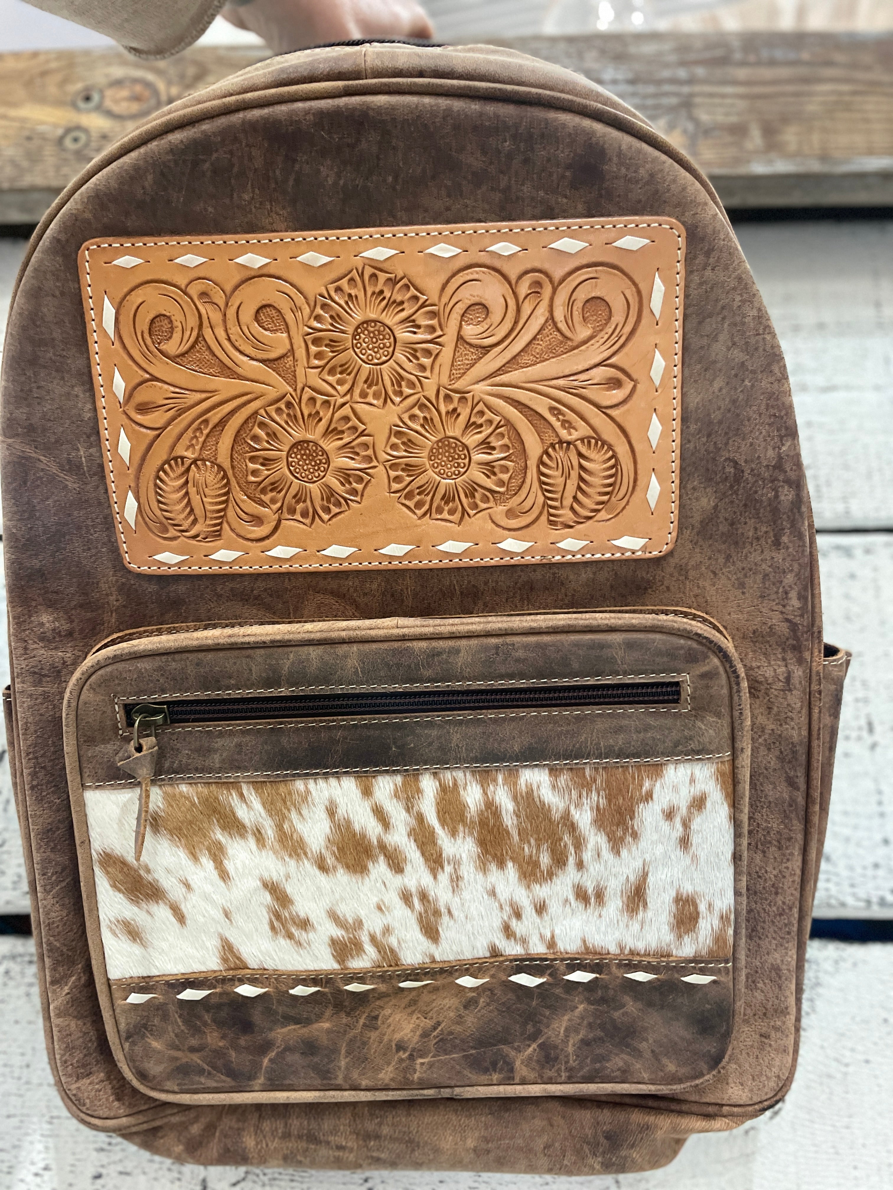 Hand made from 100%genuine leather cowhide. Hand tooled leather patch with a section of oh hair on cowhide on the front pocket. Adujustable straps to carry on both shoulders and also a small loop handle at the top. Fully lined and a separate compartment with a zip on the inside of the main section and a divider for another section at the back on the inside of the bag. Zip on front of lower pocket to secure items inside. Drink holder pocket on each side of bag.