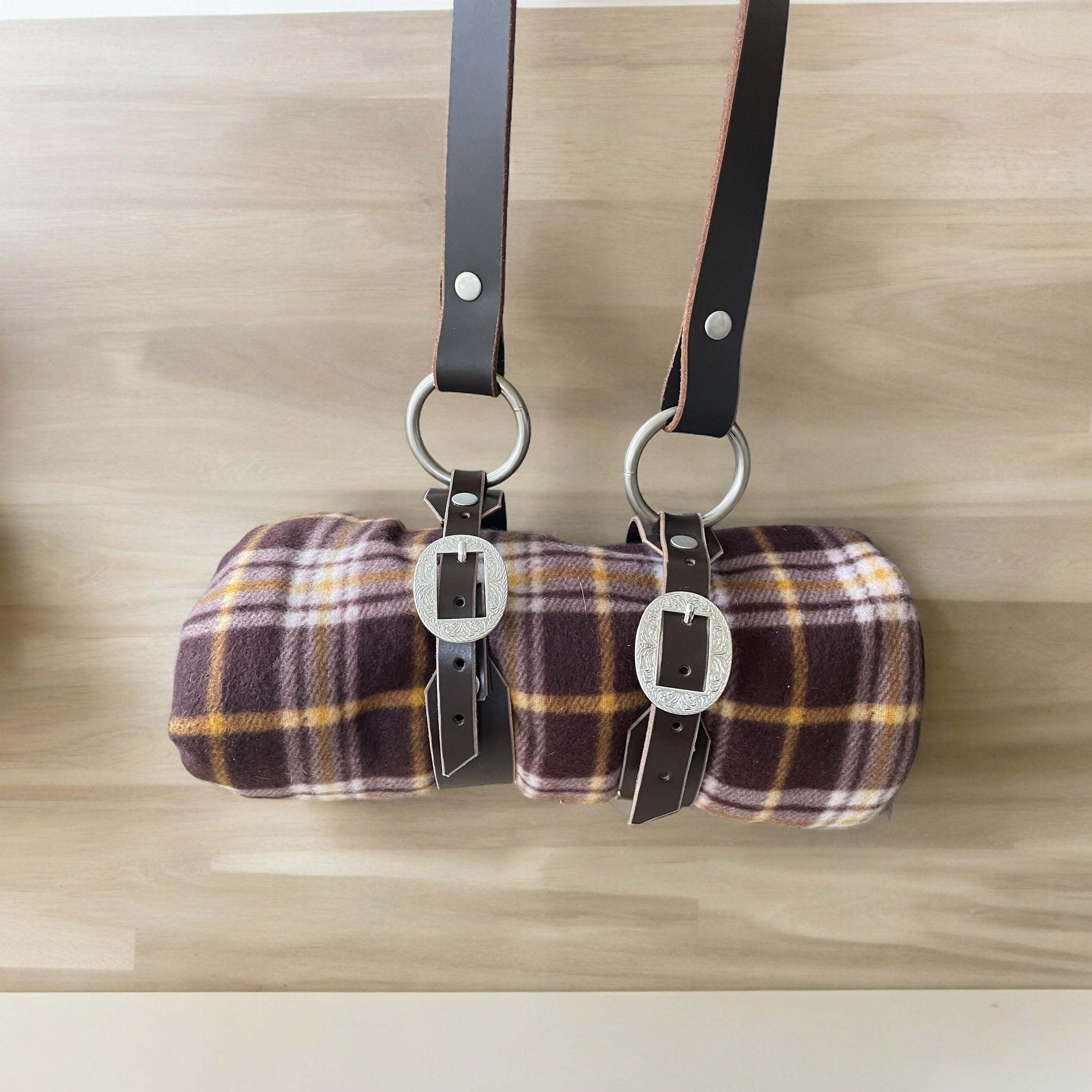 Italian high grade leather strap picnic blanket holder has two feature buckles and solid rings attached to make this carrier so easy and fully adjustable. Free up your hands whilst carrying everything else back and forth and sling this sweet blanket combo over your shoulder. 100% premium grade Italian leather this strap is sure made for longevity. Simple roll and buckle, easily stored in your home or vehicle and ultra stylish.