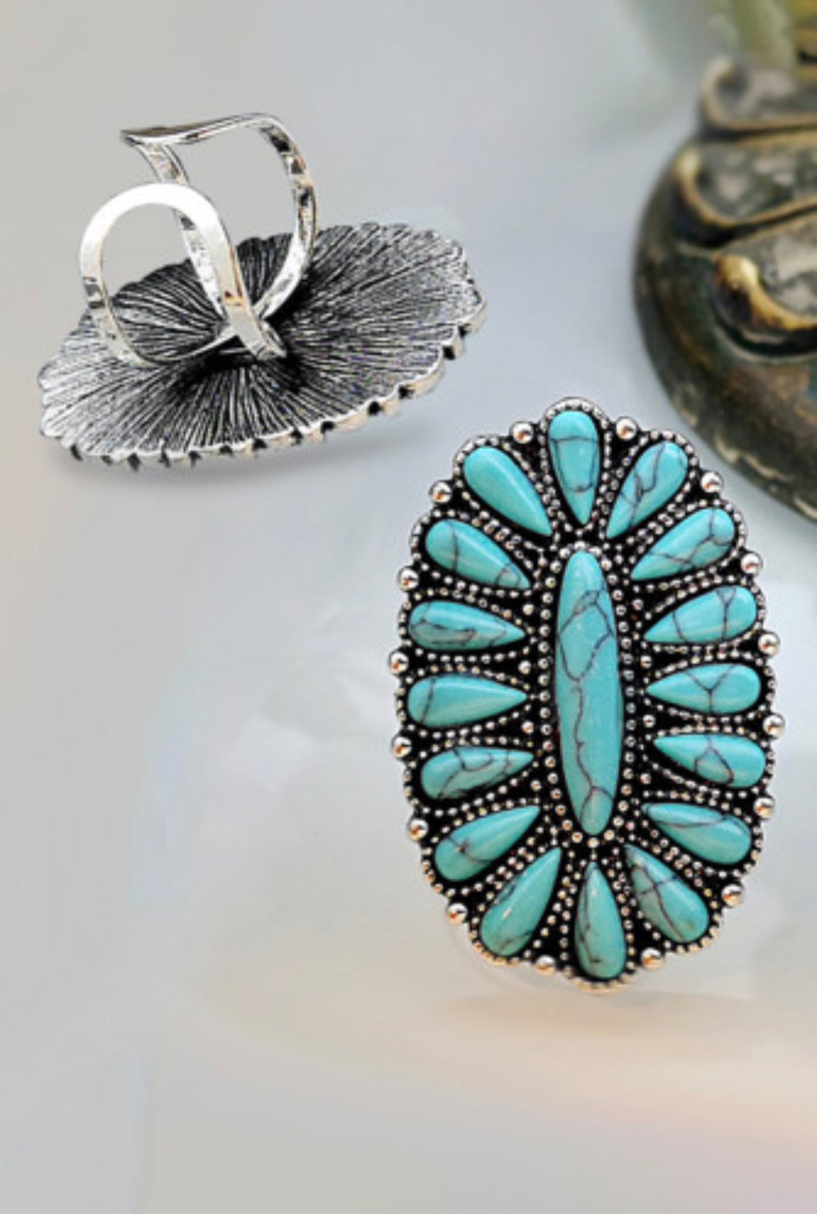 Western inspired design ring made from Turquoise coloured stones. This ring has an open back so you can adjust sizing and look fabulous in completing your outfit.