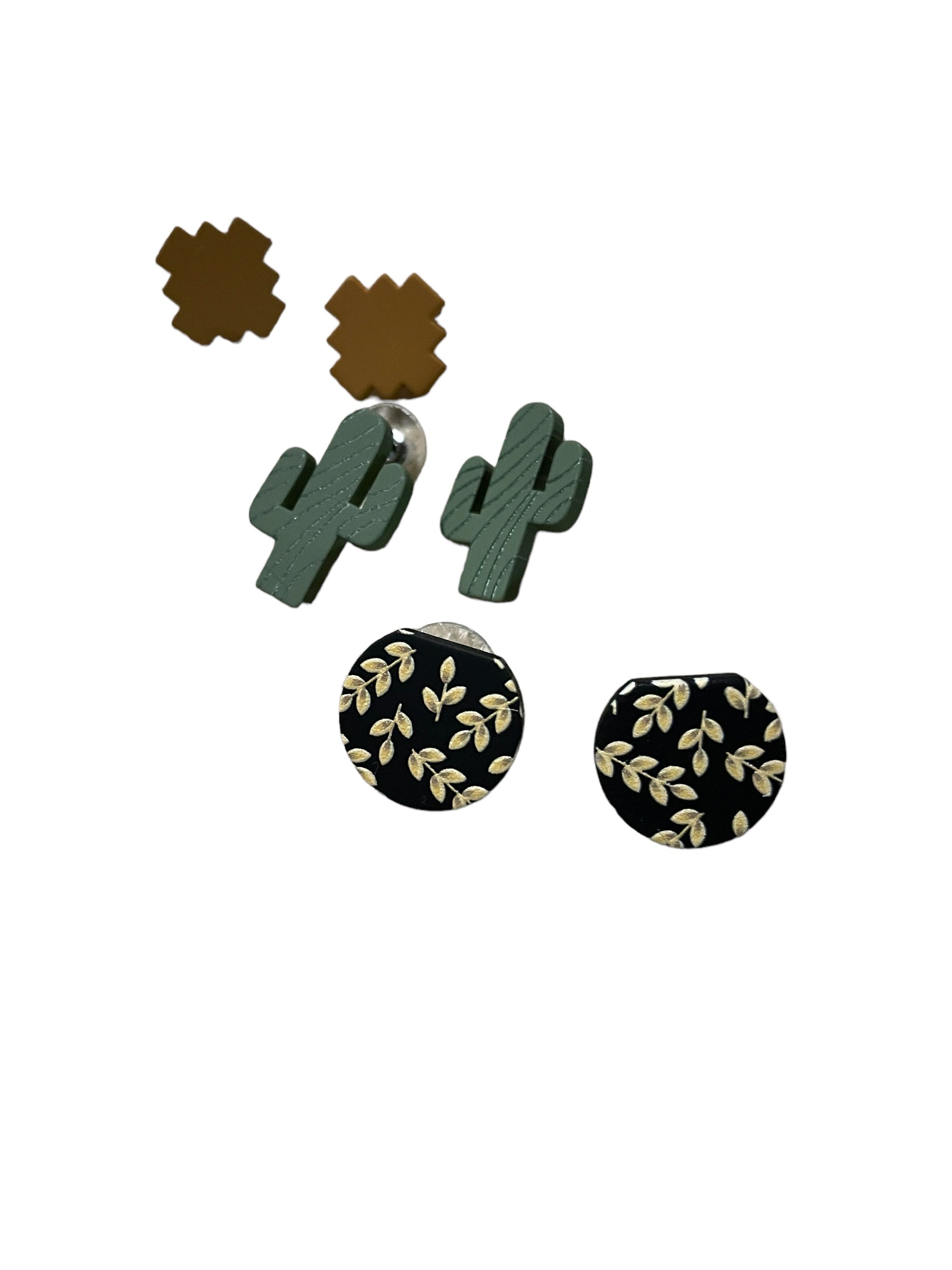 First set is our Dessert dreamer set and it includes three sets of studs including, a cute little cactus, solid aztec design, black gold print round studs.