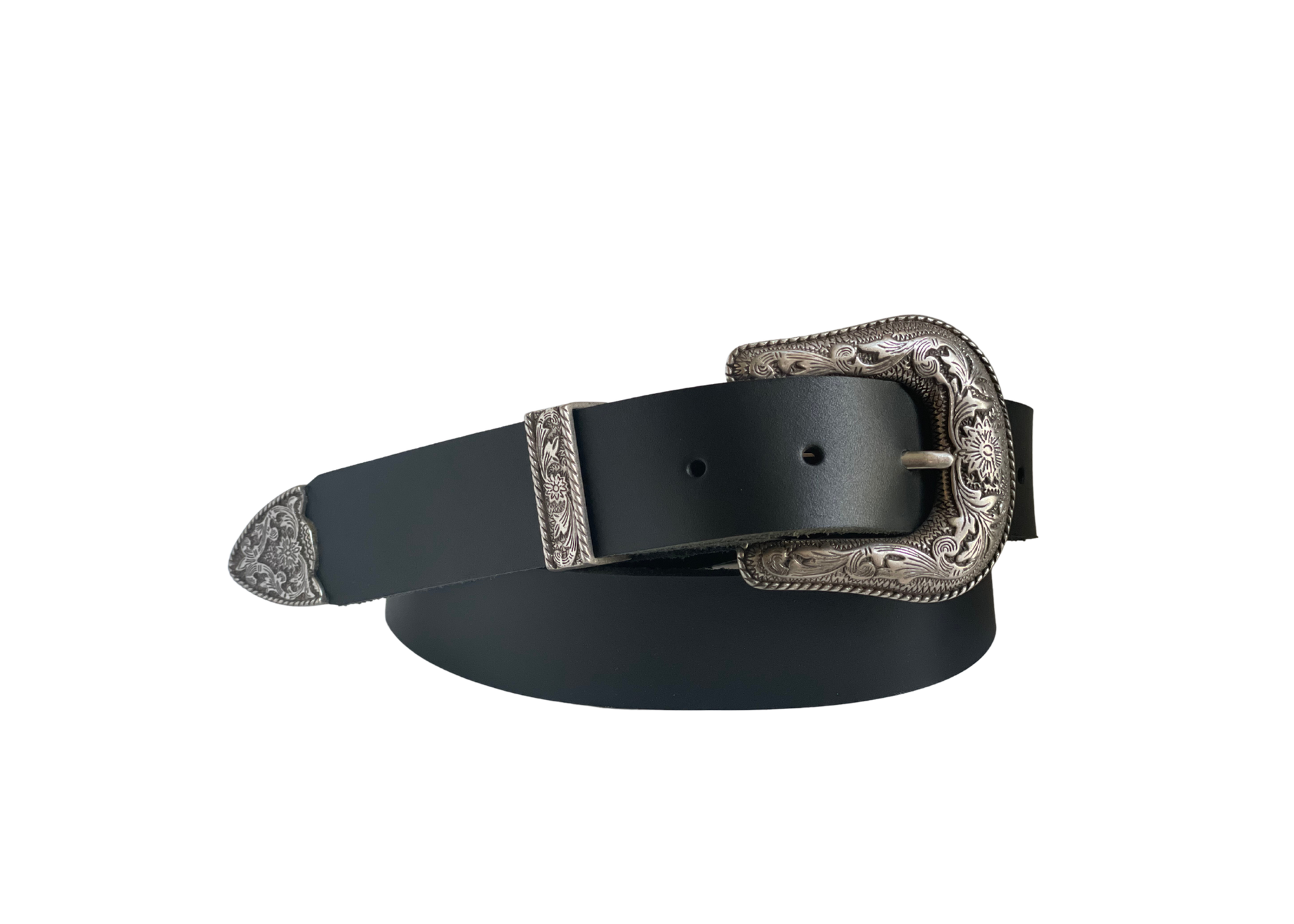 • Ladies belt with a three piece western style antique silver buckle set