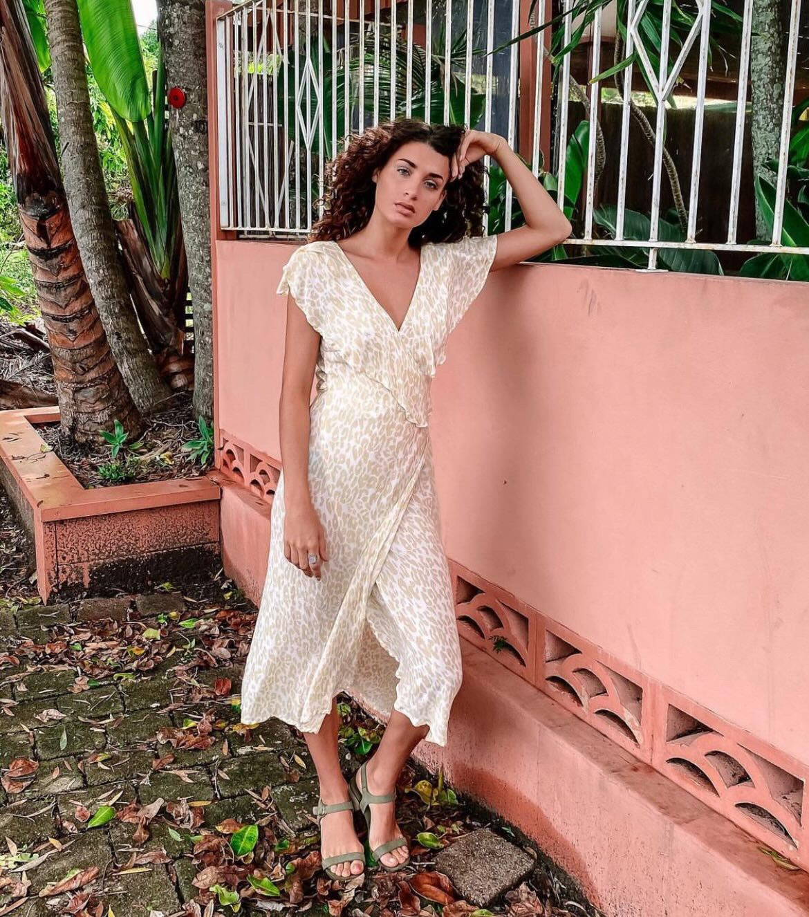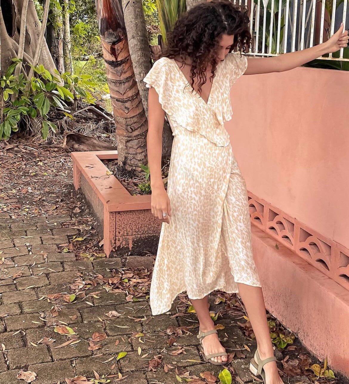 The ultimate flattering fitted dress. Sweet cross body wrap dress with slight cap sleeve. Such a feminine fitted dress. slight swish with the loose skirt and soft tone leopard print.