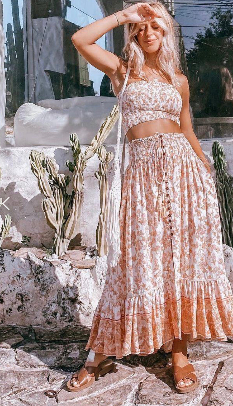 Our Miracle Style; The nomad skirt features ruched, wide, elastic waistband. A button down front with tassel ties at top and a floaty hem.