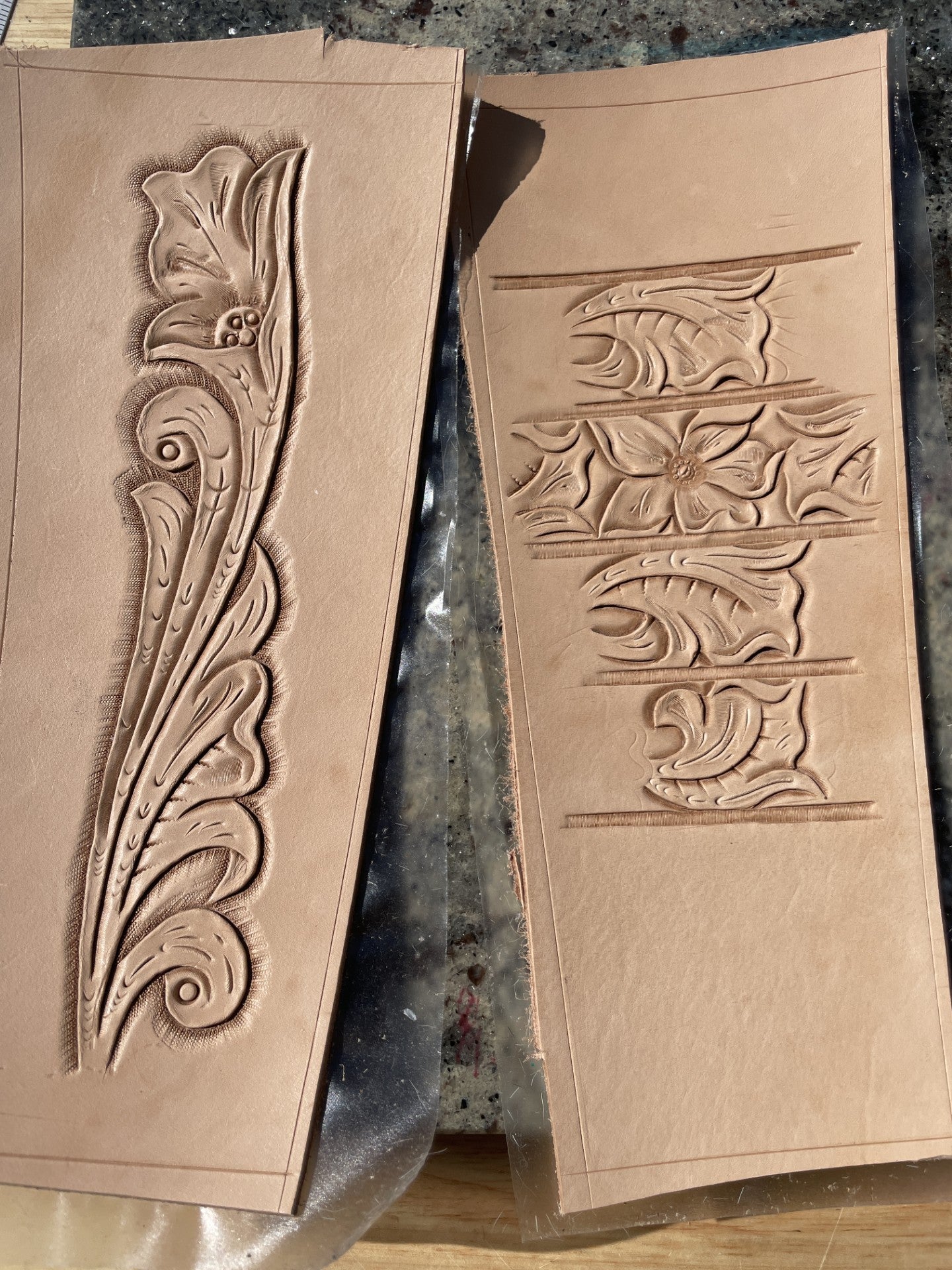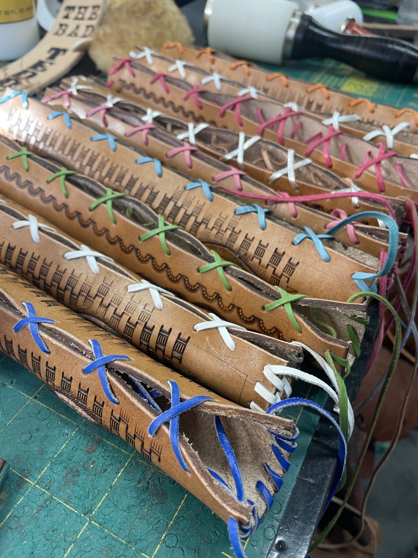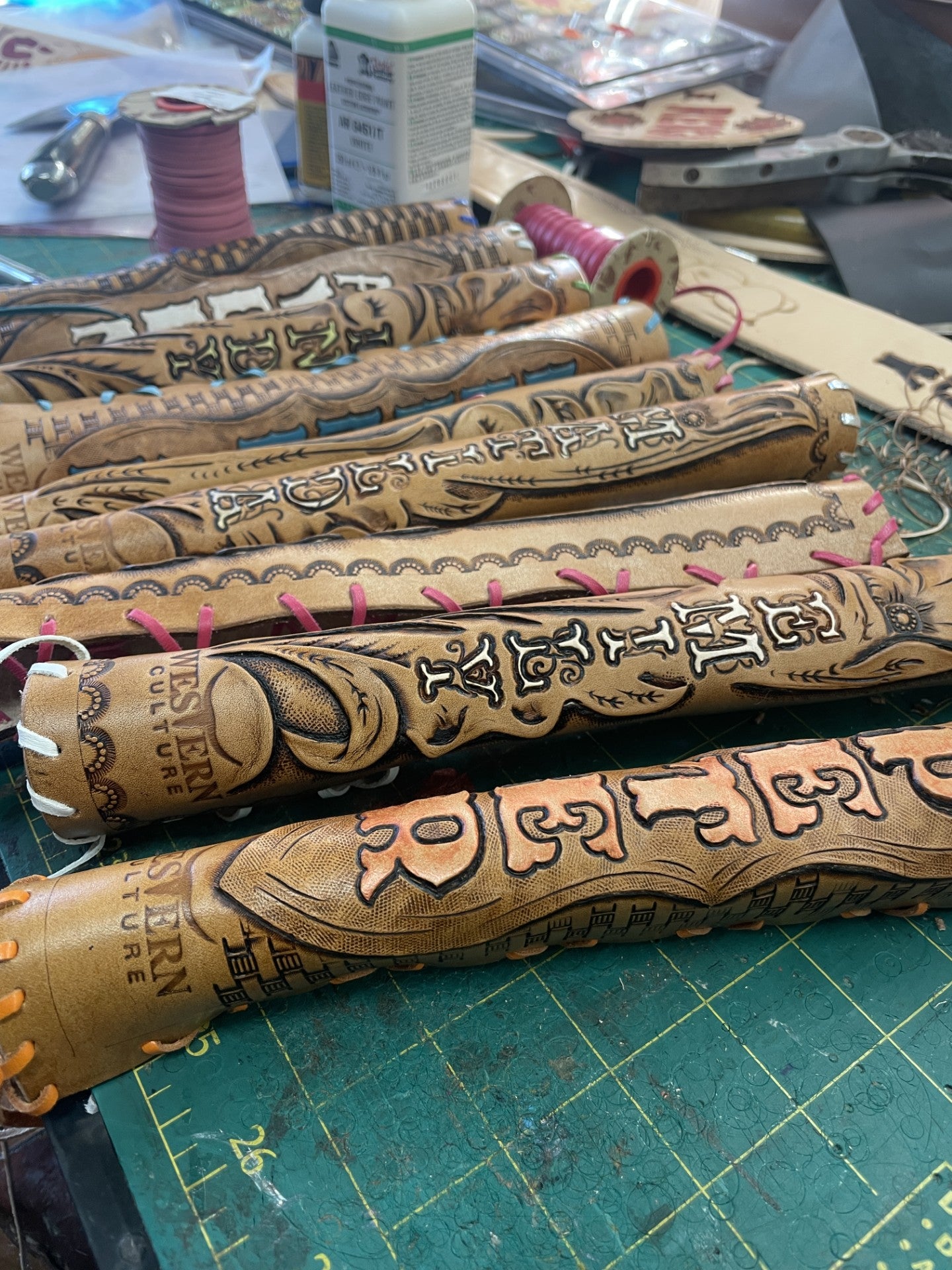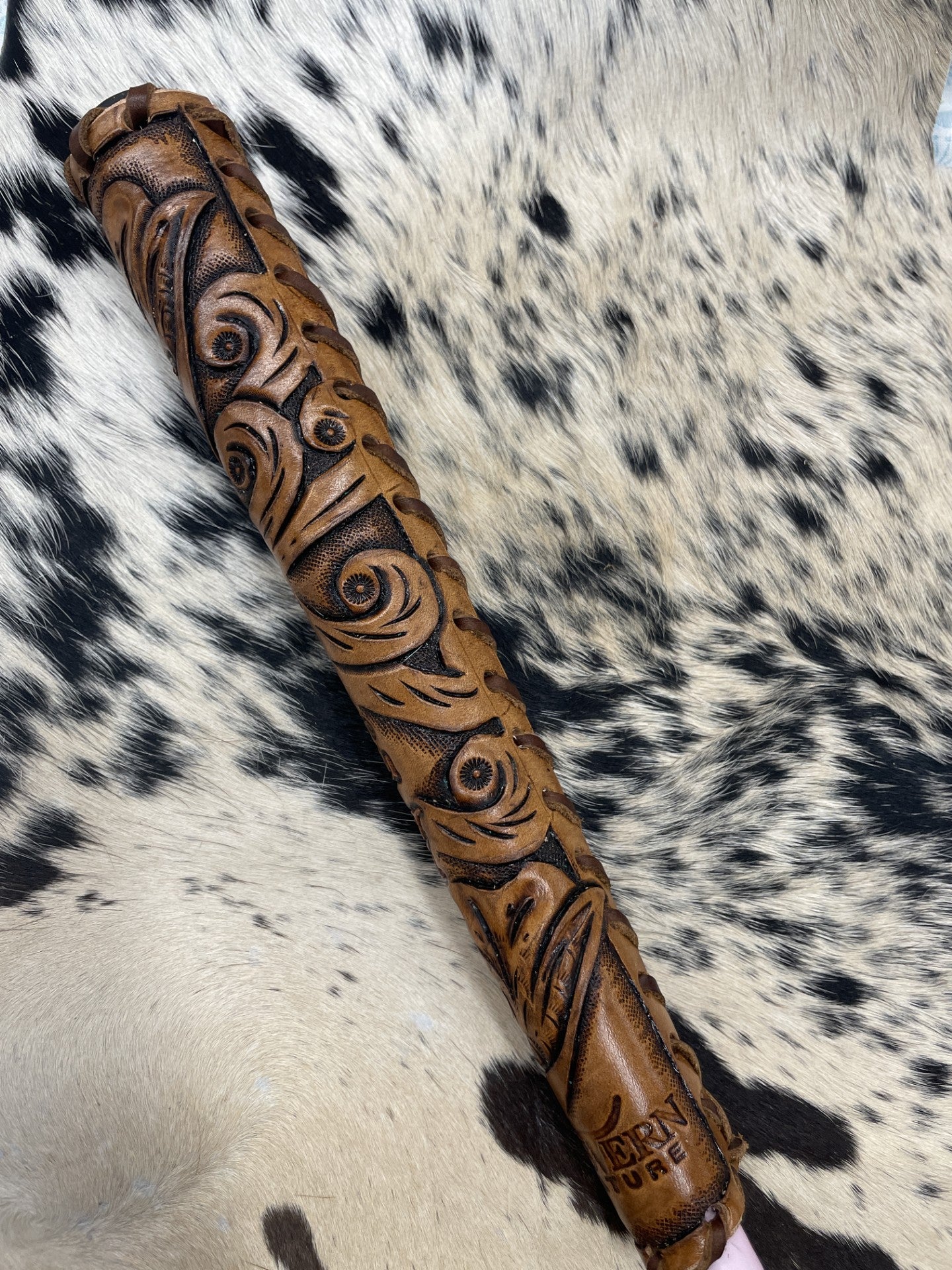 Hand crafted leather hand carved and embossed leather wrap for Cattle showing cane handle. Design your own or let us create for you. Add name or initials to personalise your wrap and select from a range of colours. Only high grade 100% genuine leather is used on the wraps.
