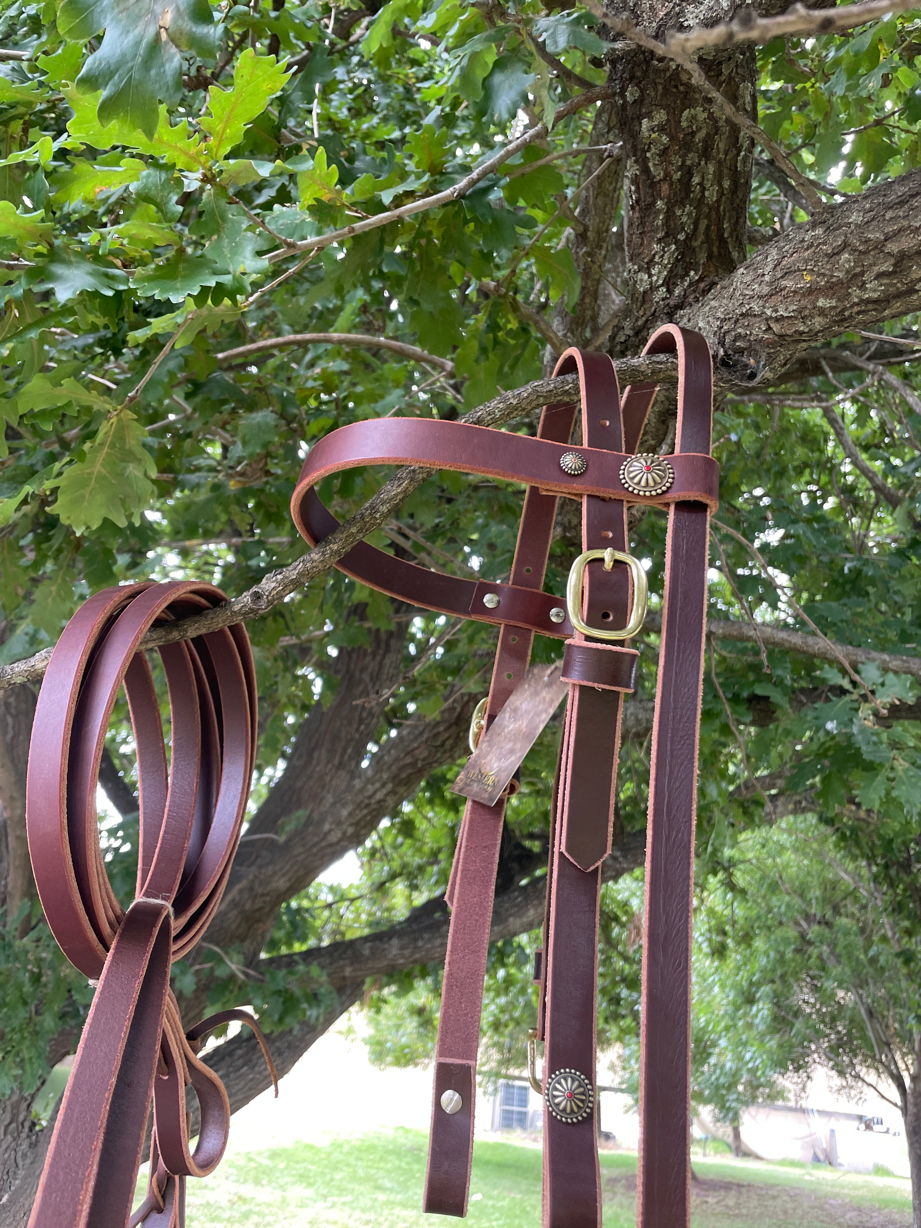 we have started our path on the bridles and reins. We have split reins, short and long reins available. We currently make our bridles to order and styles to suit the individual.