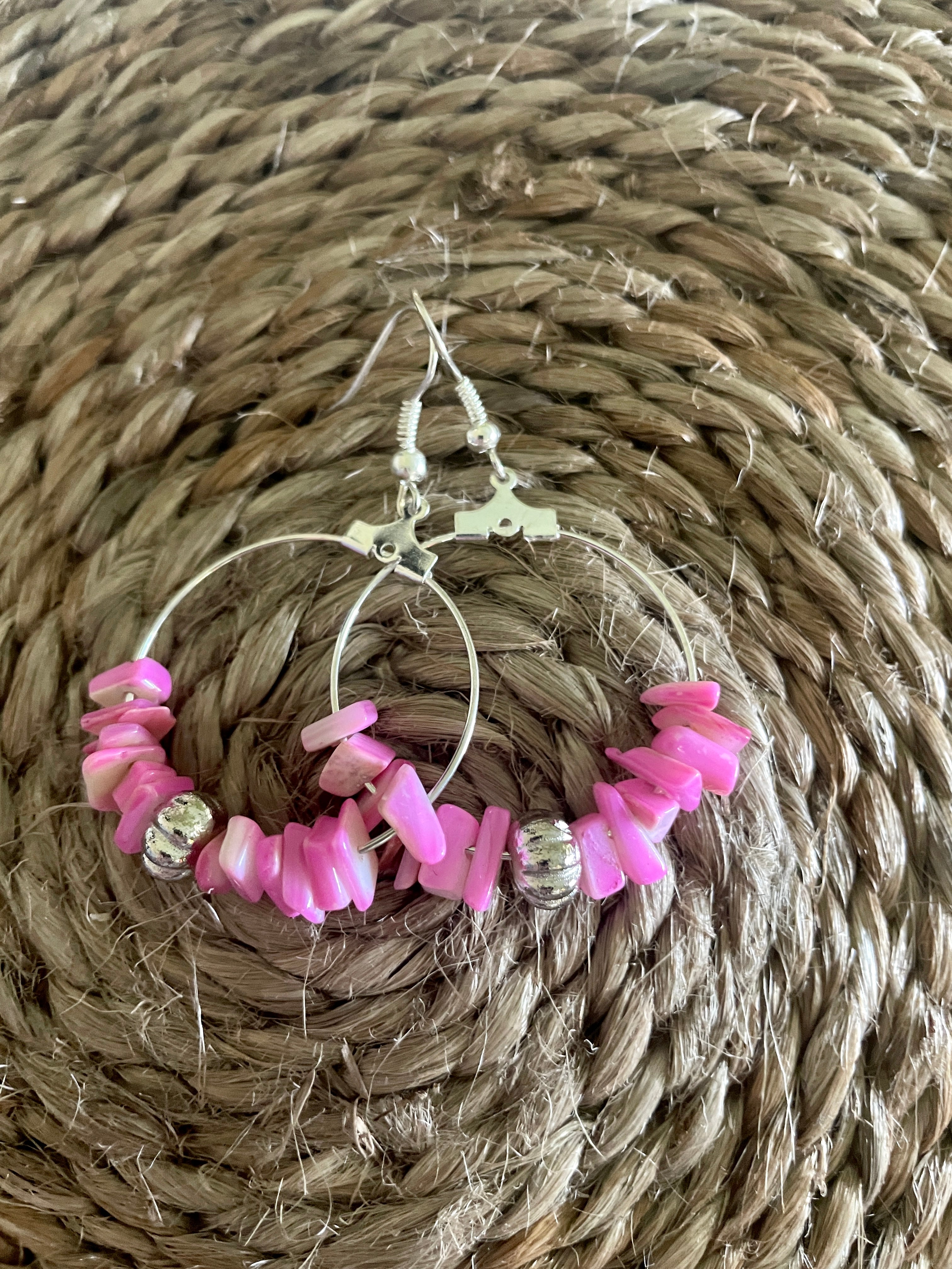 Hot pink dyed coral pieces looped onto the silver hoop with a silver feature bead for a touch of shine. These earrings are on a surgical steal silver hook so ideal for those with sensitive ears.