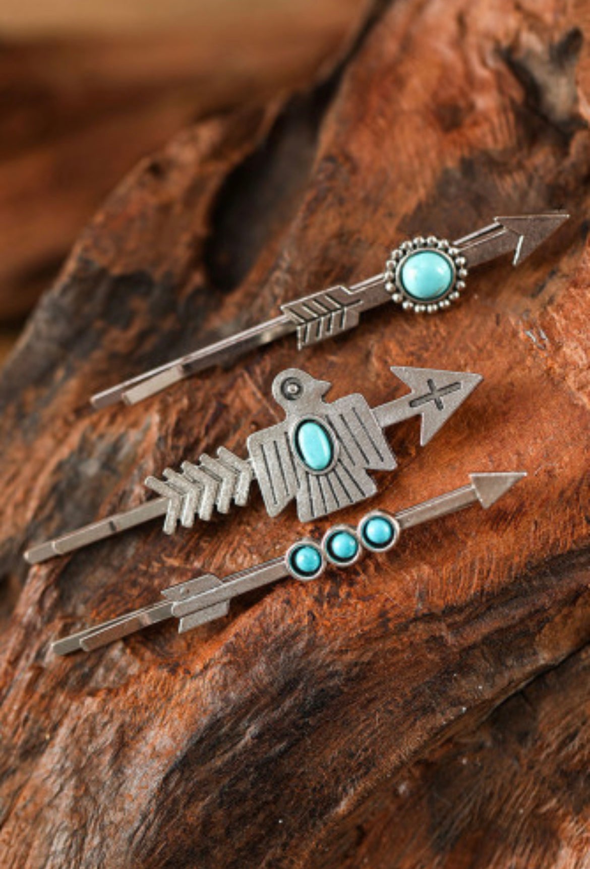 Set of three metal hair pins with a western look and small touch of turquoise.