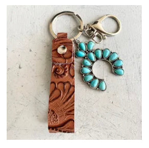 South west style charm on a leather wrist strap lanyard. Key ring and small clip makes it easy to attach to your keys, purse or wallet. Each charm has turquoise coloured stones. They're strong and great quality and oh so cute!