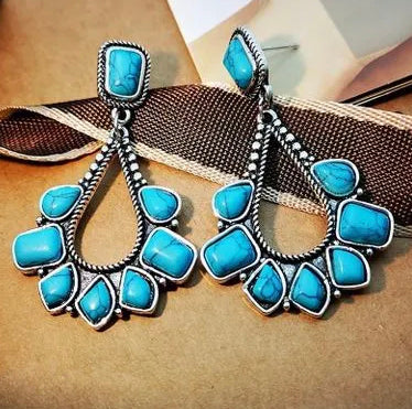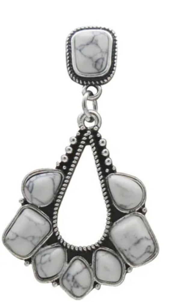 Turquoise blue or white howlite stone drop pendant style earrings. Stud post with a nice length dangle set on a silver metal frame. Approximately 55mm long 35mm across.