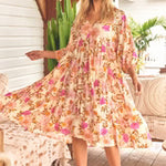 A vintage Jaase style this effortless free flowing shaped midi features crochet details and 3/4 balloon cuff sleeves for added shape.