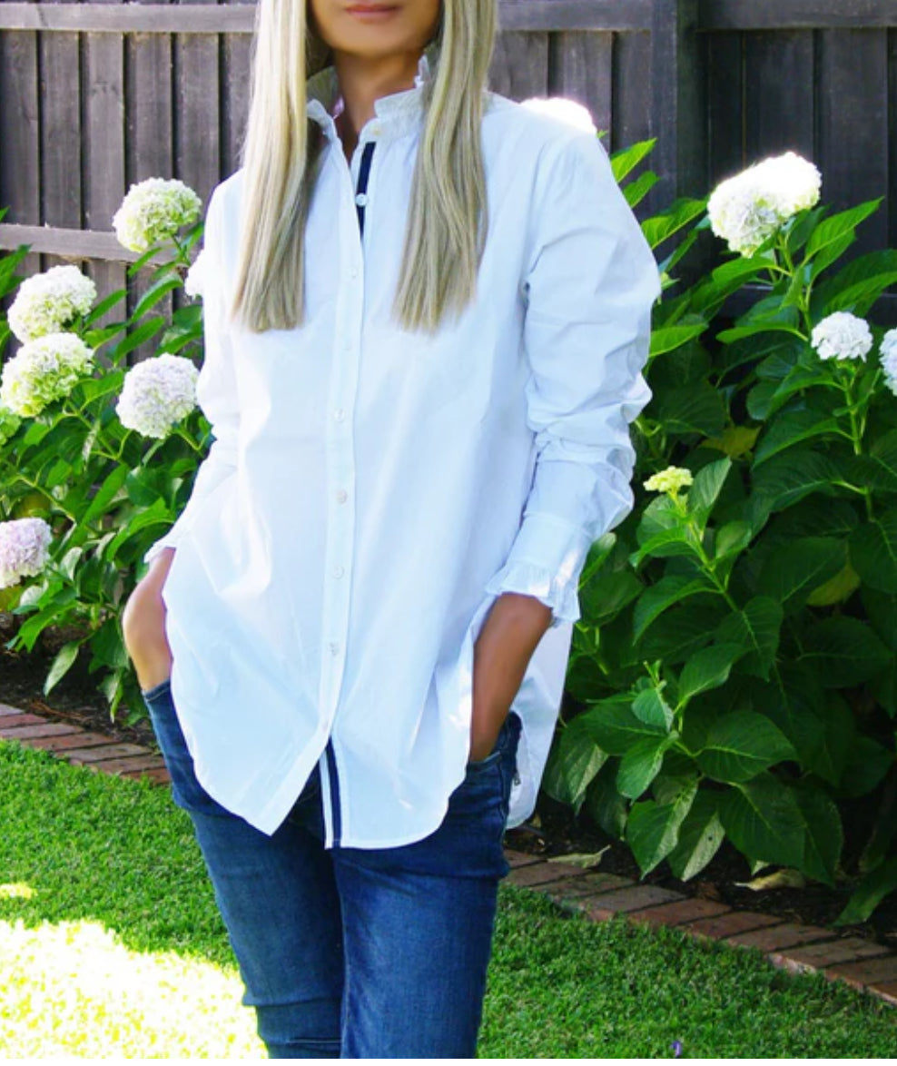 Maple is a stunning wardrobe staple item. She's long sleeve with a small frill on the end off the cuff with two pearl look buttons to fast a navy straight down stripe on the under side of the button up front and frill stand up collar just like the Poppy shirt.